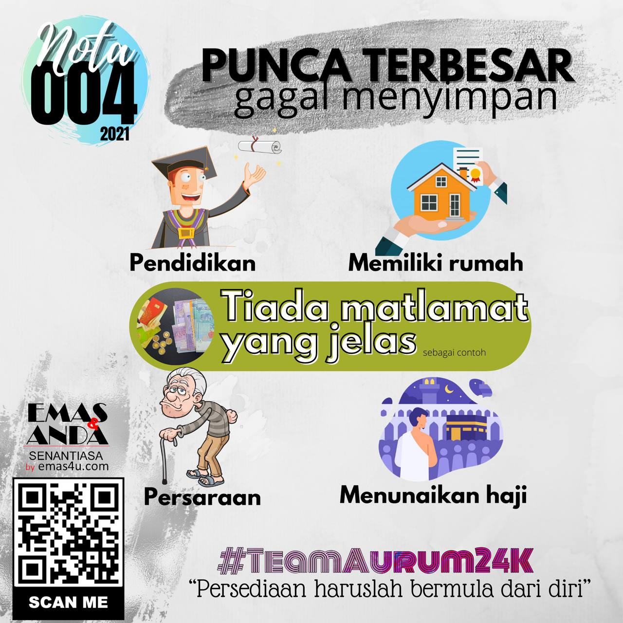 Antara faktor terbesar yang menjadi punca masyarakat tidak menyimpan adalah tiada matlamat yang jelas. Kenapa perlu menabung? Kenapa kene menyimpan? Kenapa… Kenapa…