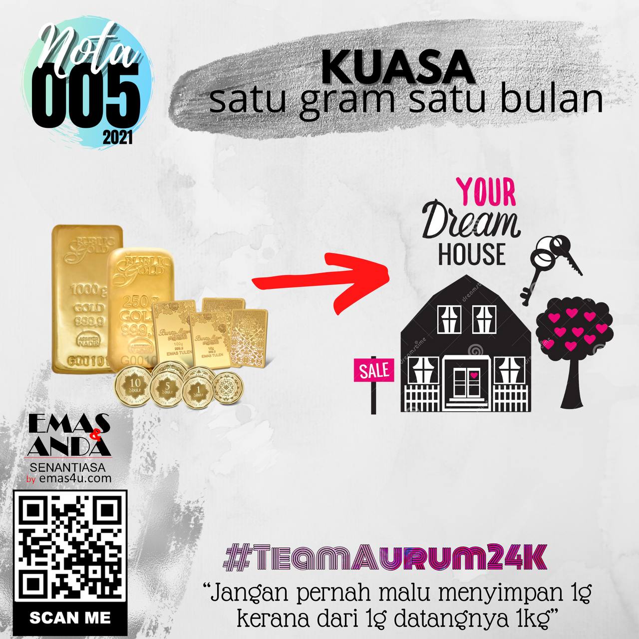 Bila dah tercapai gram yang di hajati terus jual kesemua emas tersebut untuk di jadikan modal melabur di dalam hartanah sebagai wang pendahuluan. Jadi dah tak perlu pinjam sana sini untuk buat ‘duit muka’, baik pulih mahupun ubah suai