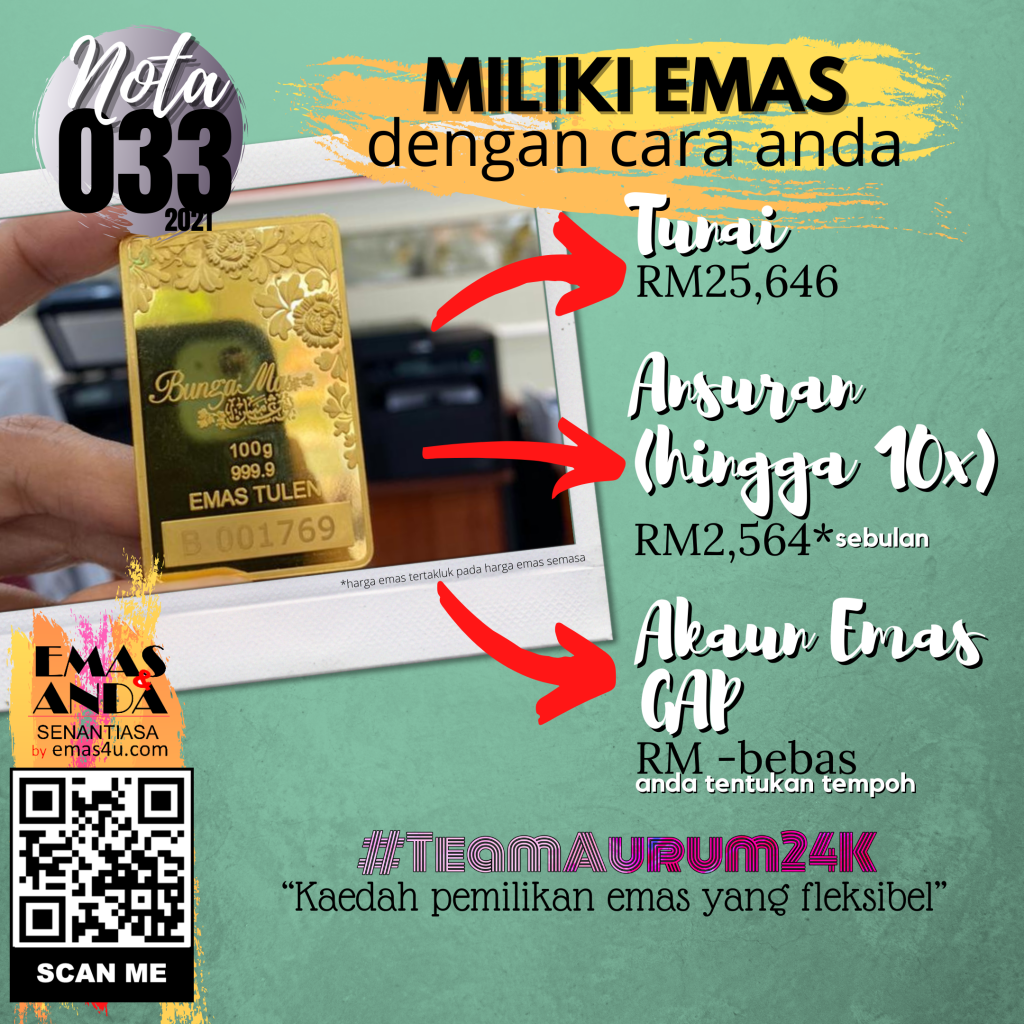 Jika tiada tunai, anda boleh memiliki 100 gram ini dengan cara pembelian ansuran sehingga 10 kali bayaran – sekitar RM2564 sebulan