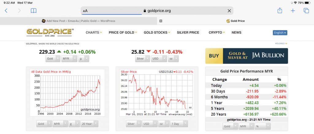 Jika anda melihat harga emas di laman web seperti Goldprice, Kitco, MKS dan sebagaianya, harga yang di paparkan tersebut adalah harga emas mentah yang belum di proses. Bahasa emasnya adalah di panggil harga ‘spot’ (spot price) atau bahasa pasarnya harga emas lombong