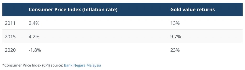 Seperti yang ditunjukkan oleh jadual di atas, pulangan tahunan emas secara signifikan mengatasi kadar inflasi tahunan. Terutama ketika ekonomi bergerak perlahan (deflasi), seperti yang dilihat oleh penurunan CPI sepanjang tahun 2020.